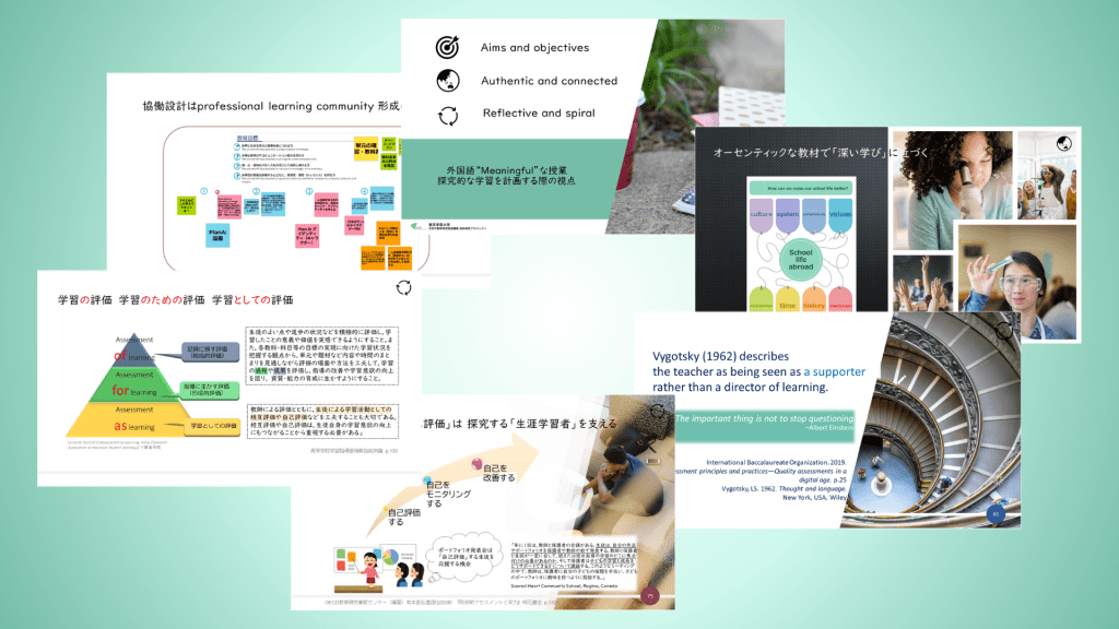 外国語科では、なぜ探究的な授業を行うのか、探究的な授業づくりに向けてどのような視点で取り組んでいけばよいのかをAims and Objectives、Authentic and Connected、Reflective and Spiralという三つの項目に分けて紹介しています。また、授業研究を始める際にご活用いただける資料も載せております。