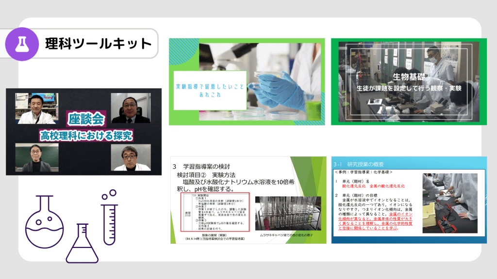 理科では、探究の過程を重視した学習に向けた対談動画や、実験実習におけるポイントの解説と授業実践の動画などが載っています。また、授業研究を始める際にご活用いただける資料も載せております。