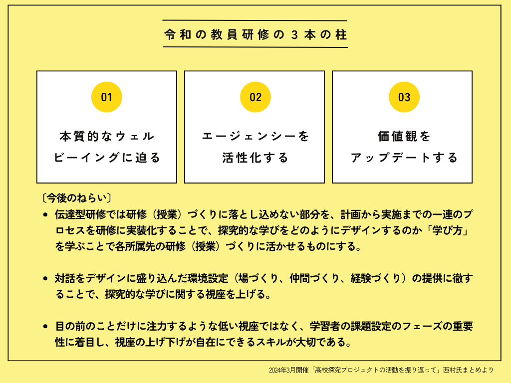 今回のWSでも、やわらかい雰囲気が探究的な学びを生み出したことは確かであり、正解がないからこそ、対話を通じた本音のフィードバックや共感を得られる場所は貴重である。それとは逆に、正解主義にとらわれると思考は固まり、発言も慎重になり、グループで学ぶことの相乗効果は見込めない。今回のWSのように温かな学習環境を実装するプロセスを通じて、本音で語ることの効果や学びの深化を実感した原体験は、各所属県の教員研修にとっても有意義なものになるに違いないだろう。