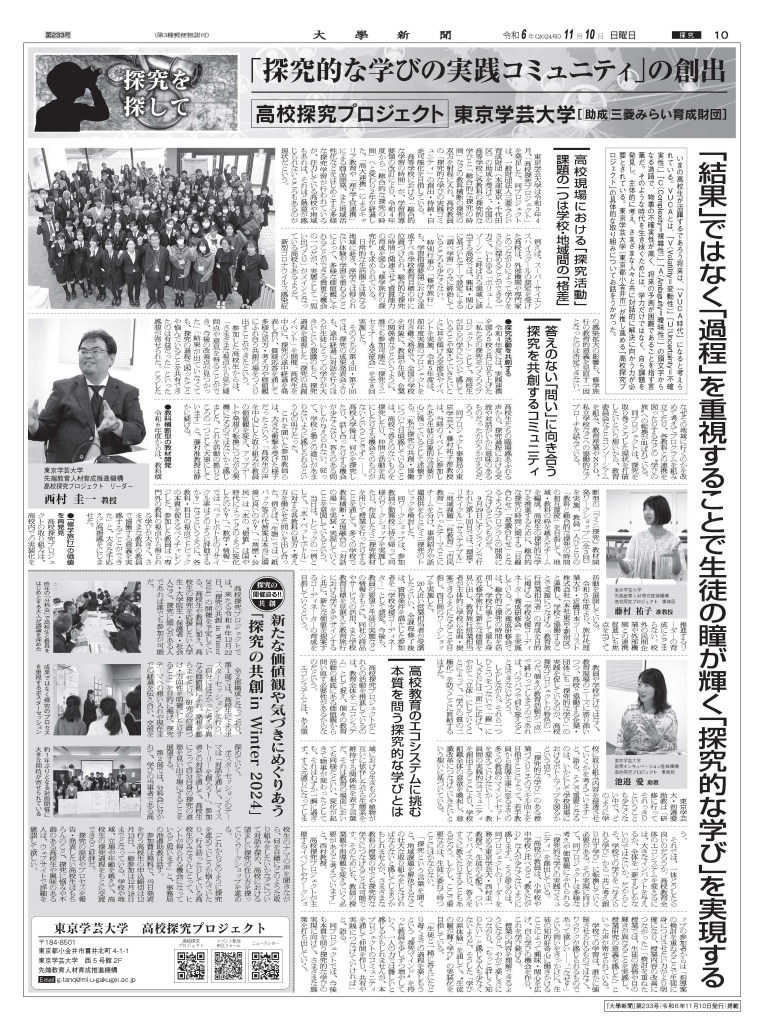 大学の情報や教育の現状、イベント情報、学生の活躍などをご紹介することで“教育のいま”をお届されている『大學新聞』第233号(令和6年11月10日発行)に高校探究プロジェクトの取材記事が掲載されました!