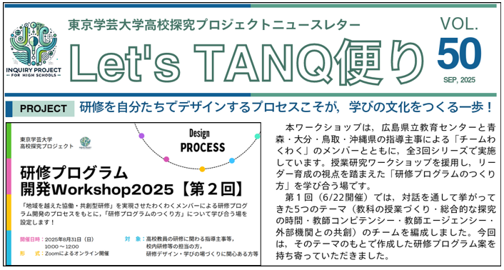 今号は、8月に実施しました「研修プログラム開発ワークショップ2025【第2回】」と9月に開催しました「『ミニ探究』デザインワークショップ【第2回】」の開催報告です。