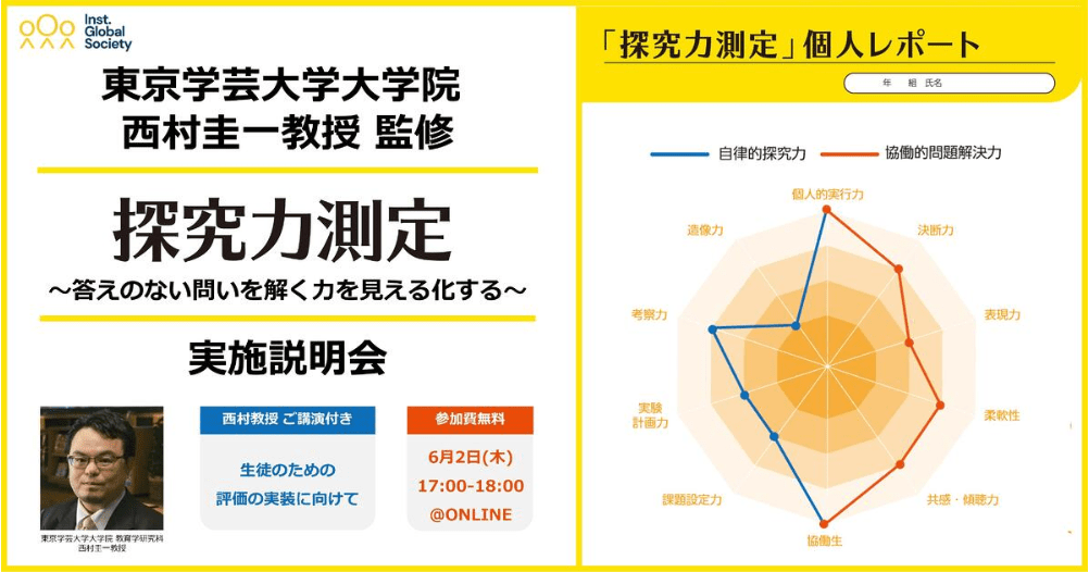 本プロジェクトに協賛いただいているIGSが開発された「探究力測定パッケージ」の説明会が実施されます。
