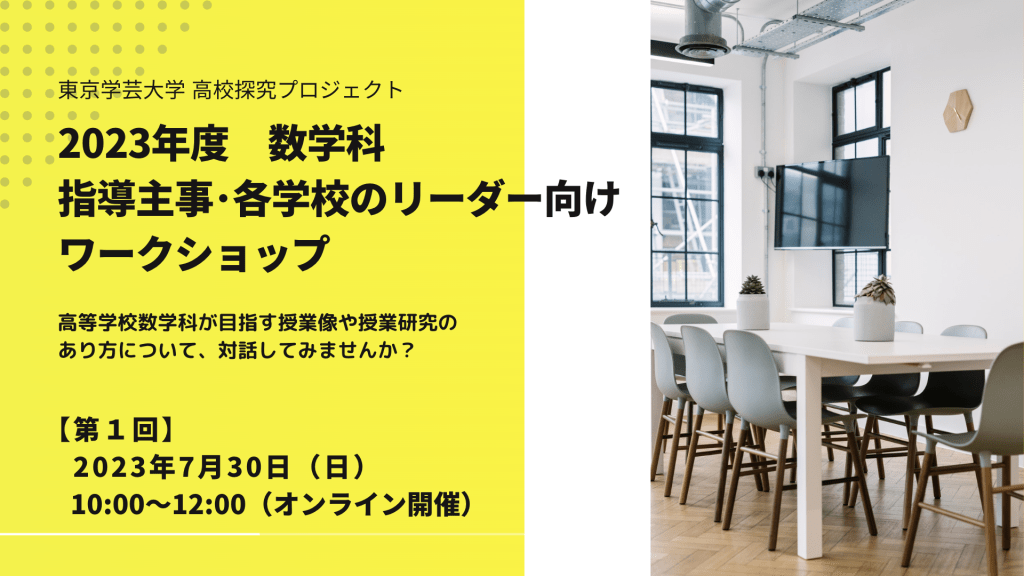 第1回のワークショップでは、これから研究授業を行うチームの授業者とメンバーにお越しいただき、実際に指導案を検討する様子を見ていただきます。本ワークショップの参加者のみなさまからも、ご質問やご意見を頂戴する機会を設けます。その後、大学教員等とともに、高等学校数学科が目指す授業像や、チームで授業をつくりあげる上でのファシリテーターのあり方について、参加者全員で、対話を通して考えていきます。