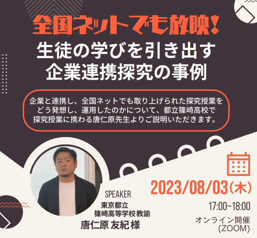 高校探究プロジェクトの連携校である東京都立篠崎高校の唐仁原友先生が登壇されるセミナーのご案内です。7月28日(金)が締切のため、お早めにお申し込みください。