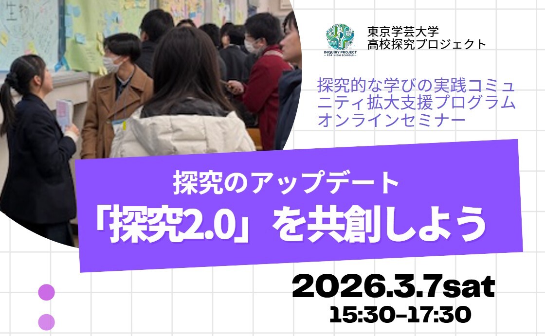 こうした日本社会の状況を踏まえ、高校探究プロジェクトでは、高校における探究をより対話志向で、他者に開かれた探究を『探究2.0』と位置づけ、その実践コミュニティを全国の高校生や先生方とともに拡げていき機会にしたく「探究のアップデート『探究2.0』を共創しよう」と題するオンラインセミナーを開催します。