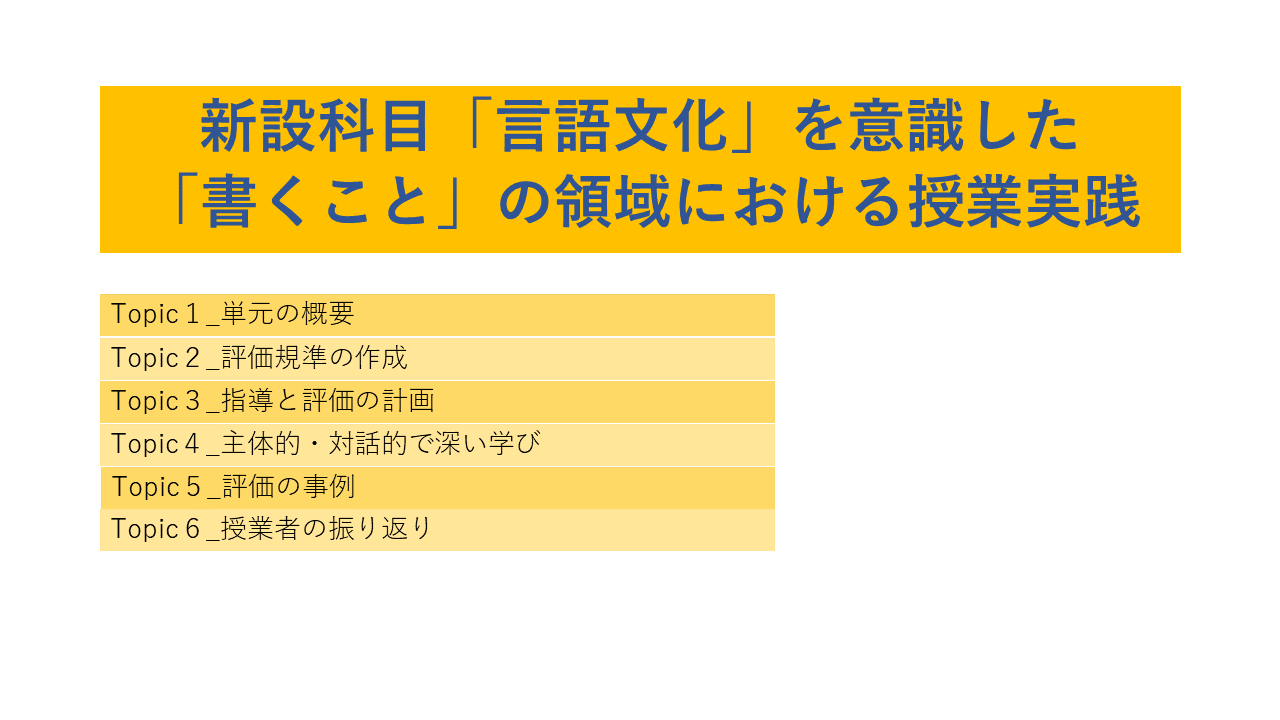 「言語文化」における「書くこと」の授業づくりについて、書き方偏重の指導にならないために、授業研究チームが検討し協議した過程を追体験するスライド教材になっています。