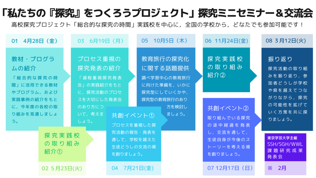 今年度より、探究的な学びの実装化・充実に向けた情報共有・交流の場として、全国のどの学校からでも、どなたでも参加可能な「探究ミニセミナー&交流会」(全8回)を定期的に開催してきました。
