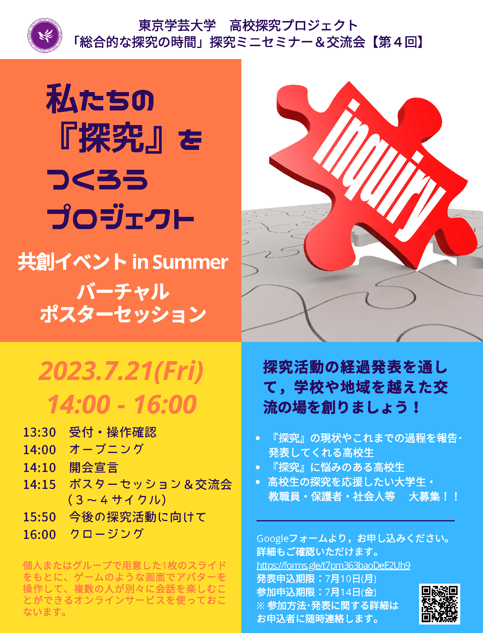 これらの声をうけて、7月21日(金)に、探究過程を重視した「共創イベント in Summer」~バーチャルポスターセッション~を開催します。学校や地域、立場や年齢を越えた探究の交流の場をともに創り出しましょう!