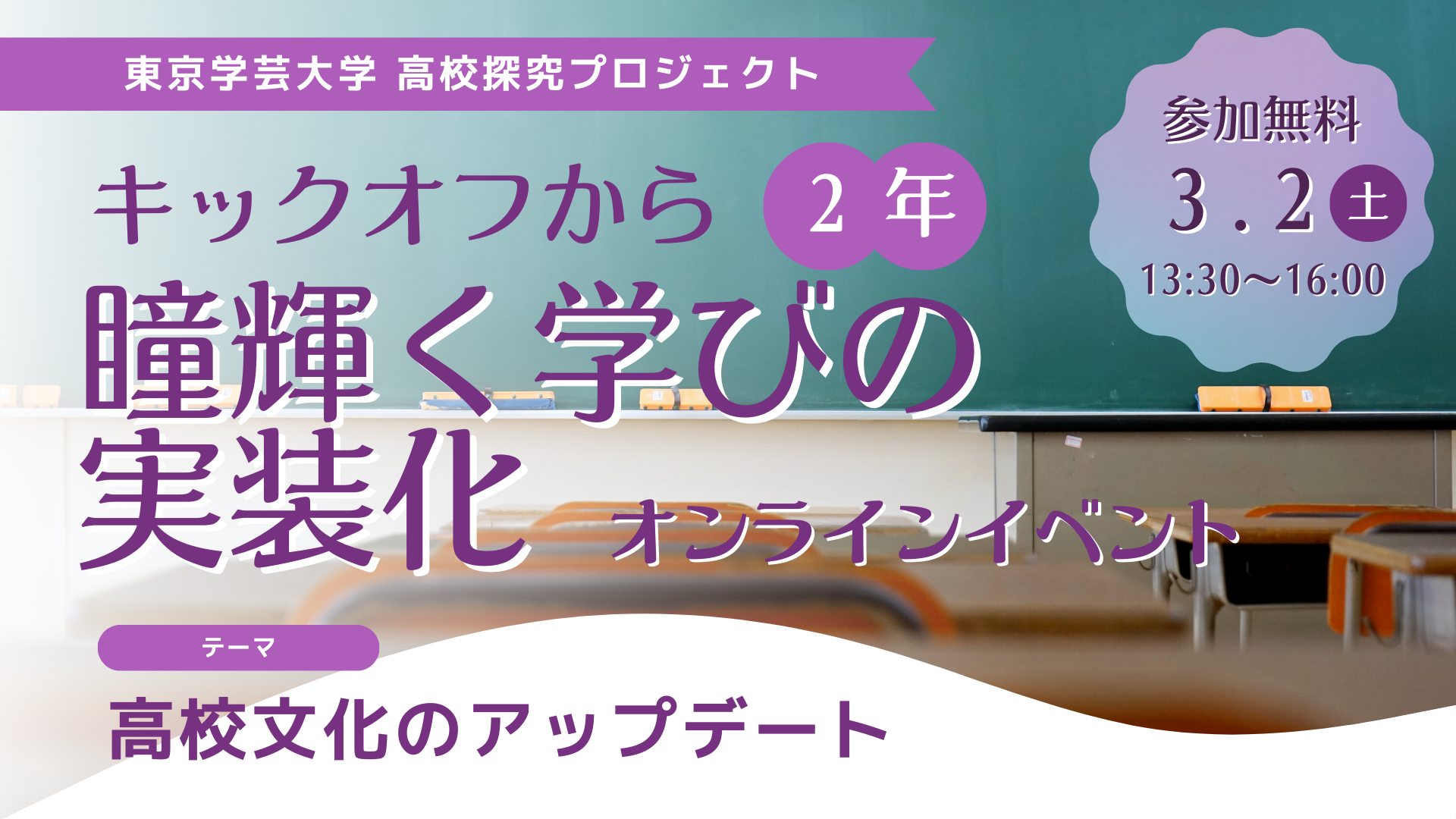 そこで、この2年間の活動を振り返りつつ、高校の新たな「当たり前」にしたいことを共に探り、次なる一歩につなげたいと考え、『瞳輝く学びの実装化~高校文化のアップデート~』オンラインイベントを開催いたします。